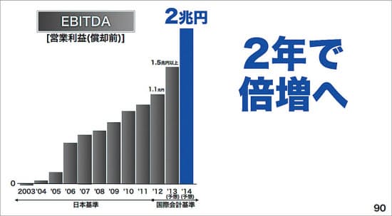 確固とした構成が決まれば、実は「表現」は難しくない。まずは下のEBITDAのスライドを見てほしい。極めてシンプルなこの1枚に、ソフトバンク流が凝縮されている。