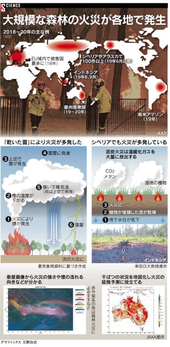 大規模な森林火災が世界各地で発生している。オーストラリアで2019年から続いていた火災は、日本の面積の3分の1ほどにあたる1260万ヘクタール以上が焼失した。森林火災があまり見られなかったアラスカやシベリアなど北極圏近くでも近年、多発している。地球温暖化やそれに伴う異常気象が拍車をかけているという見方が強まっている。