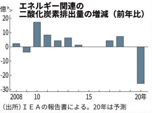 IEAは20年のエネルギー関連の二酸化炭素(CO2)の排出量は前年比8%(約26億トン)の減少になると予測した。08年秋に起きたリーマン・ショックの影響を大きく上回る。英国に拠点を置く気候変動分析サイト「カーボン・ブリーフ」もCO2の排出量が同5.5%減ると推計した。新型コロナ拡大による都市封鎖や航空機の運航停止で化石燃料需要が急減したことが要因という。
