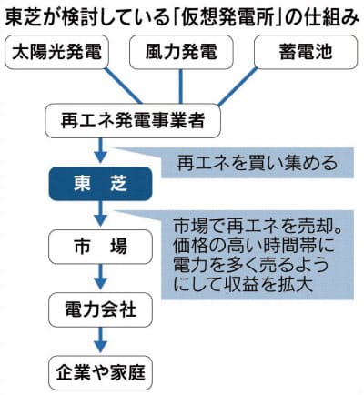 新会社は発電量を予測したり、電力売買の助言をしたりする。東芝は新会社と協力し、再生エネ施設や蓄電池をIT通信網でつなぎ再生エネを買い集める。日本全国にある風力や太陽光発電の設備を持つ事業者に参加をつのる。