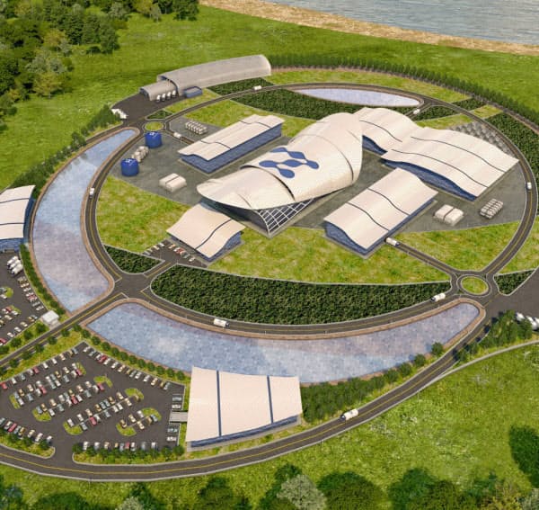 米国では2007年創業のスタートアップ、ニュースケール・パワーが脚光を浴びる。標準的な炉は100万キロワット級だが、同社が扱うのは数万キロワット。外観のイメージ図に原発特有の巨大な建屋や冷却塔はなく、体育館のような施設が並ぶ。